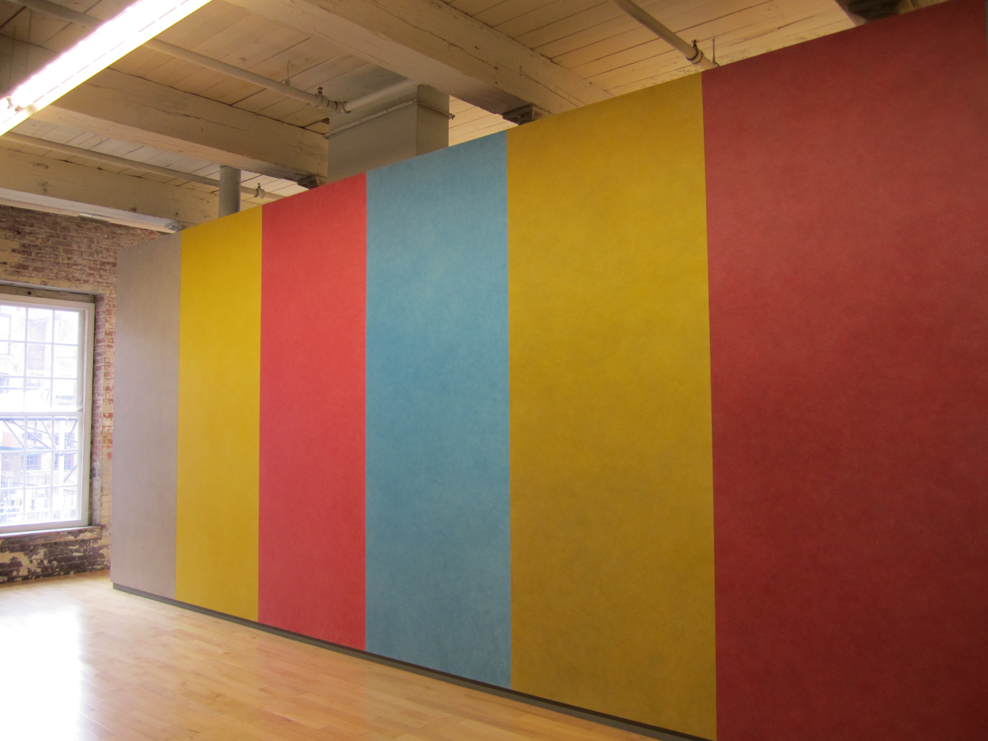 全部で15枚の色のパネルが並ぶのですが、4つの色(グレー、黄、赤、青)がまず基本になり、その中の2色を掛け合わせたものが新たに6色、3色の掛け合わせが4色、4色の掛け合わせが1色、左から右へ順番に並んでいます。左の写真は4つの原色が並んでいるところ、右の写真は手前から2色×1、3色×4、4色×1が順番に奥に向かって並んでいます。微妙な曇ったニュアンスのある美しい色調は、日本人の私の感覚にとてもしっくりきます。並んだ様は、歌舞伎の引幕を思い浮かべました。